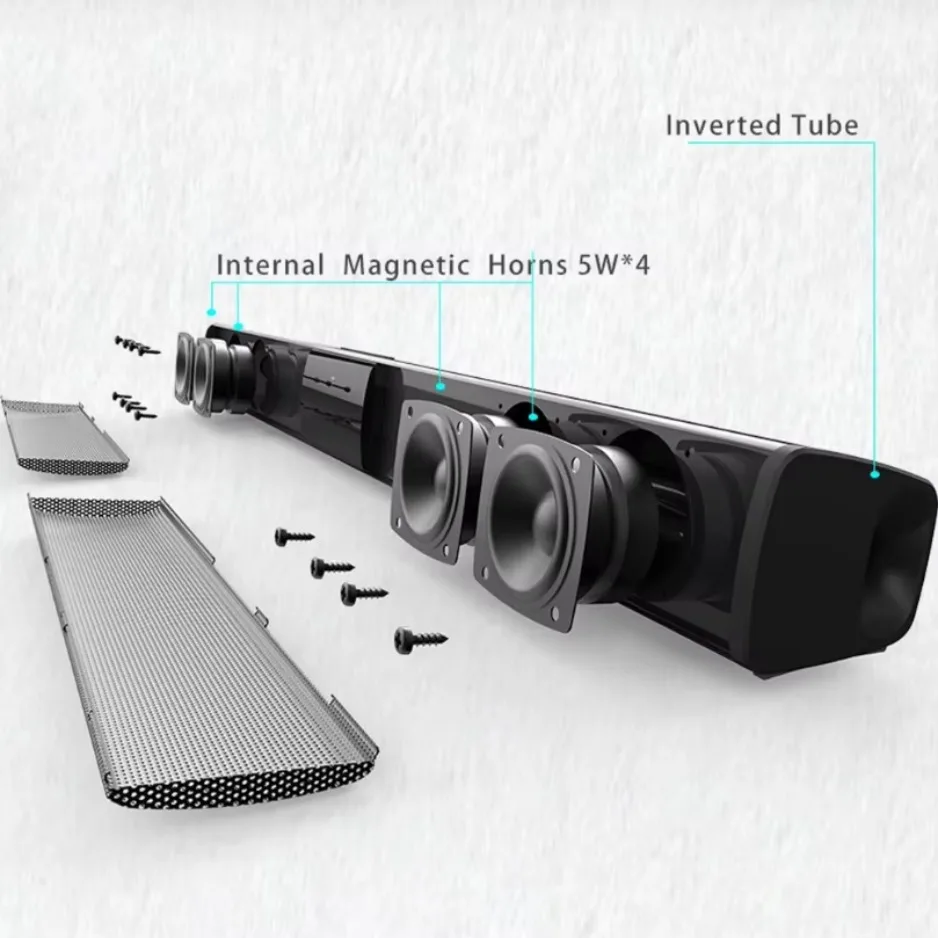 Built for versatility, this soundbar supports multiple input options including RCA, AUX, and TF card, allowing easy connection to TVs, computers, and media players. The included remote control provides convenient access to volume and playback settings from anywhere in the room. Sleek, compact, and easy to use, this soundbar is a practical upgrade for any home entertainment setup.